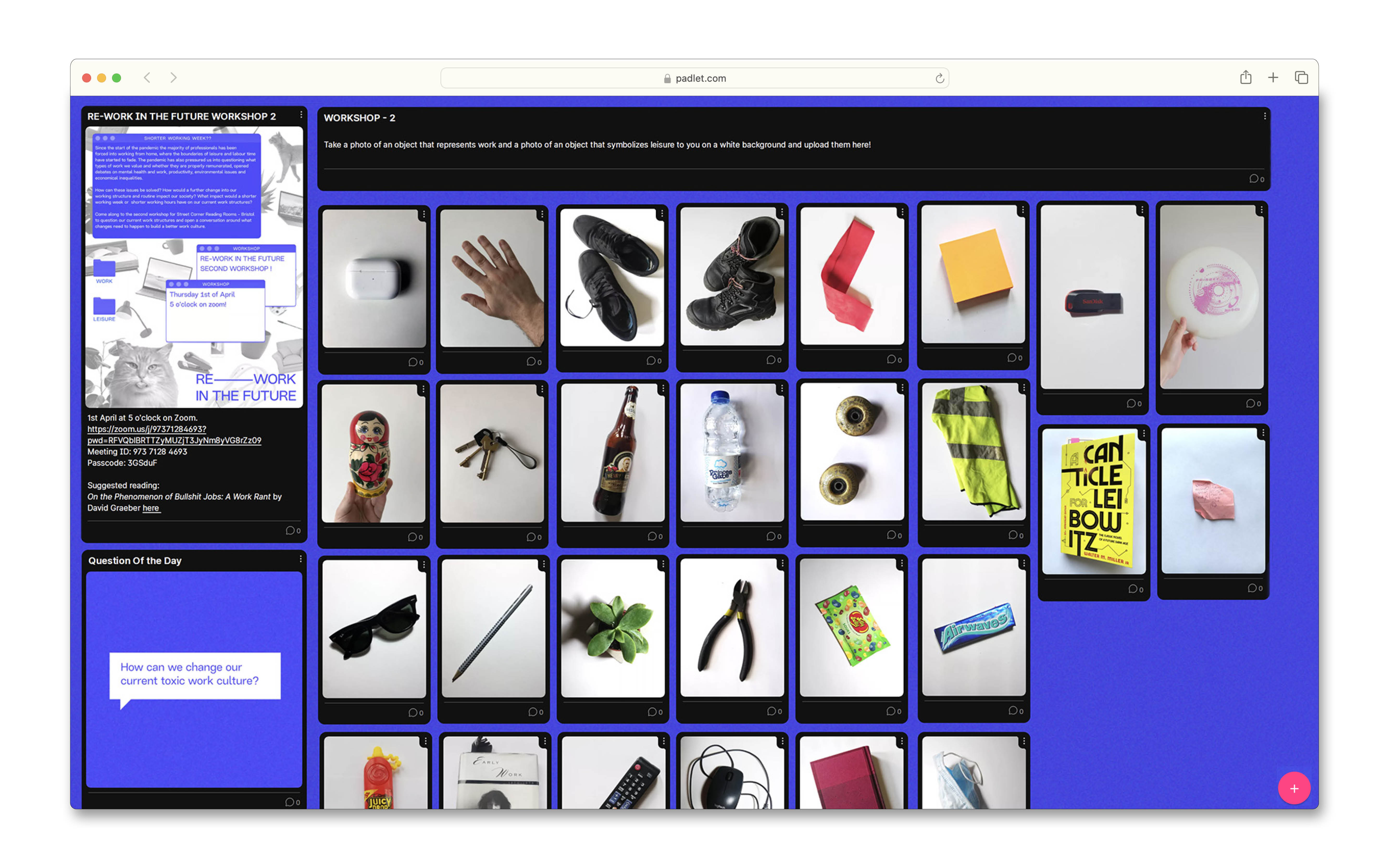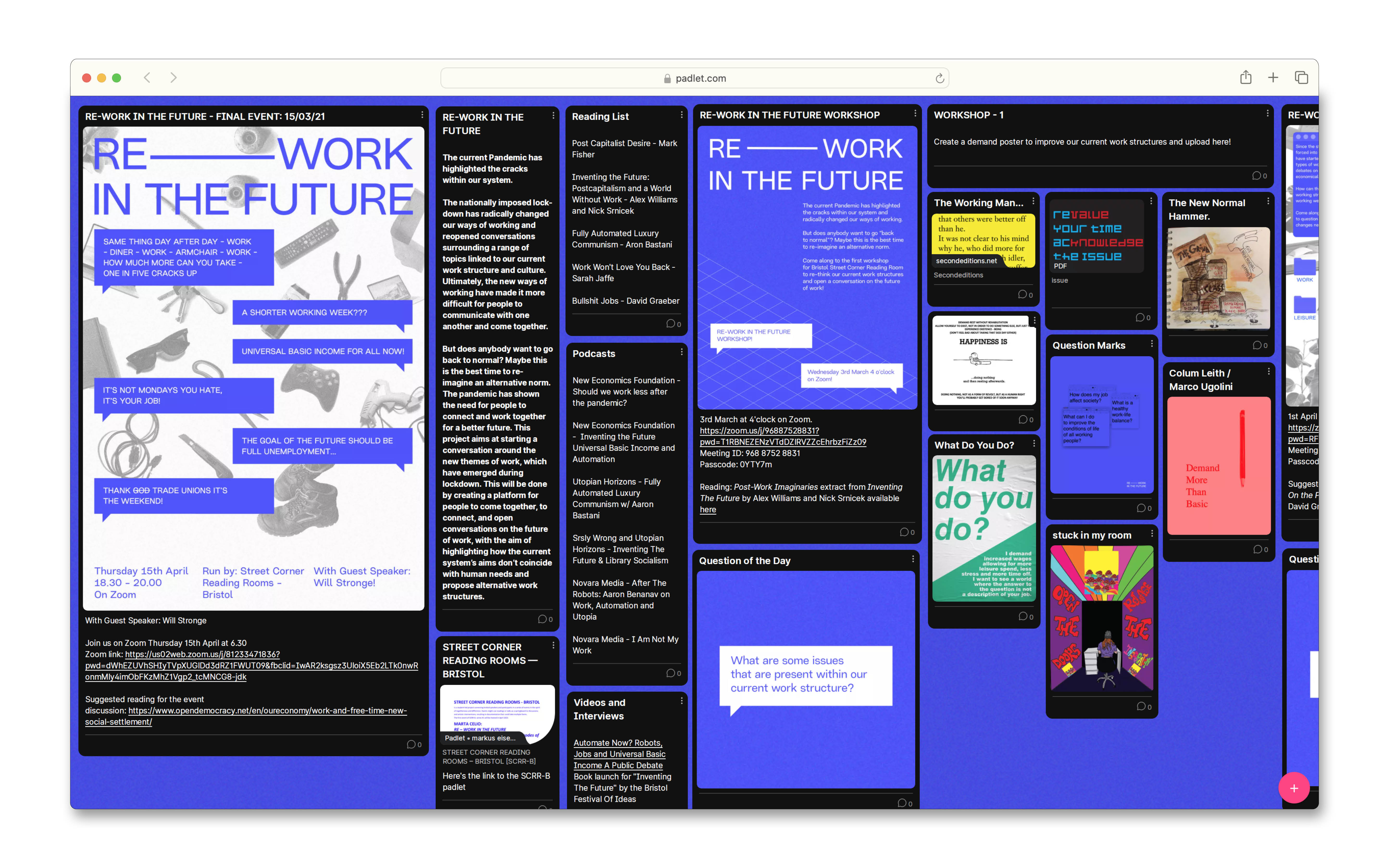 Re-Work In the Future is a collaborative research project developed with STREET CORNER READING ROOMS, initiated by the Graphic Design, Fine Arts, and Philosophy department at UWE. My proposal aimed to stimulate discussions surrounding emerging work-related themes during lockdown. The project focused on a series of workshops designed to foster connections and facilitate dialogues through creative avenues, culminating in an online event featuring guest speaker Will Strong from AUTONOMY think tank.